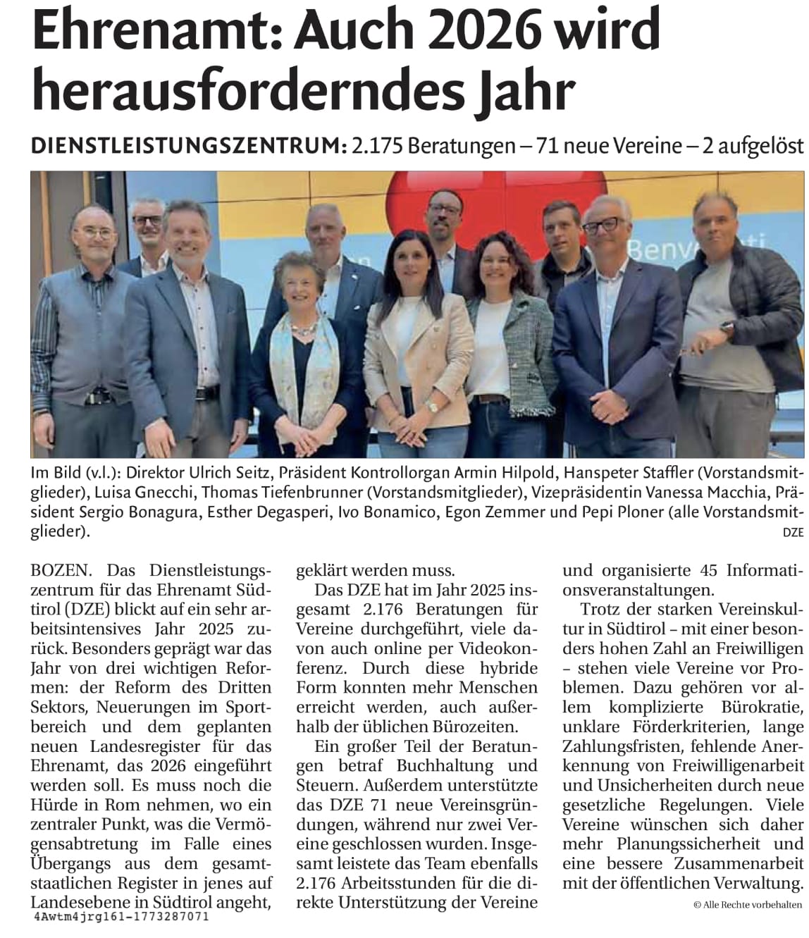 Das Dienstleistungszentrum für das Ehrenamt Südtirol zieht Bilanz im Hinblick auf ein äußerst arbeitsintensives Jahr 2025, das vor allem von 3 Reformen, die derzeit das Vereinswesen prägen, gekennzeichnet waren. Es handelt sich konkret um die Reform des Dritten Sektors, die Neuerungen rund um den Sport, sowie die Folgen, die sich aus der Aktivierung des Neuen Landesregisters zum Ehrenamt, das im Laufe des Jahres 2026, Realität werden sollte, ergeben. Letzteres muss noch die Hürde in Rom nehmen, wo ein zentraler Punkt was die Vermögensabtretung im Falle von einem Übergang aus dem Nationalen Register in jenes auf Landesebene in Südtirol angeht, geklärt werden muss.